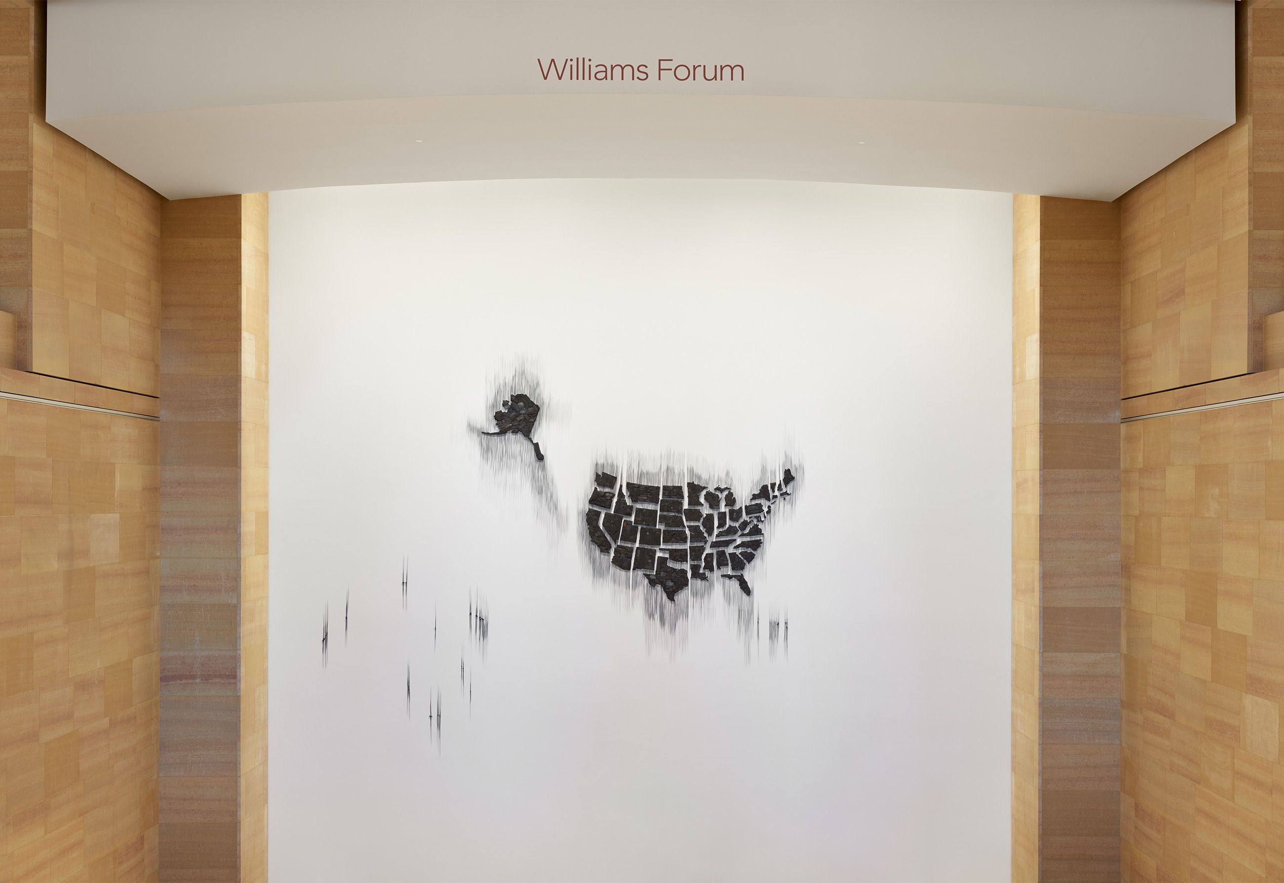 Teresita Fernández unearths and exposes hidden histories embedded in landscape. In this striking installation, she renders the continental United States, Alaska, Hawaii, and all the US territories as scorched earth. Through the use of charcoal and hand-drawn smoky shadows, she invokes fire as a symbol of both destruction and regeneration. By questioning perceptions about nation, borders, and land, Fernández invites us to radically reimagine what the future of America means when we become active participants in forging new histories.
